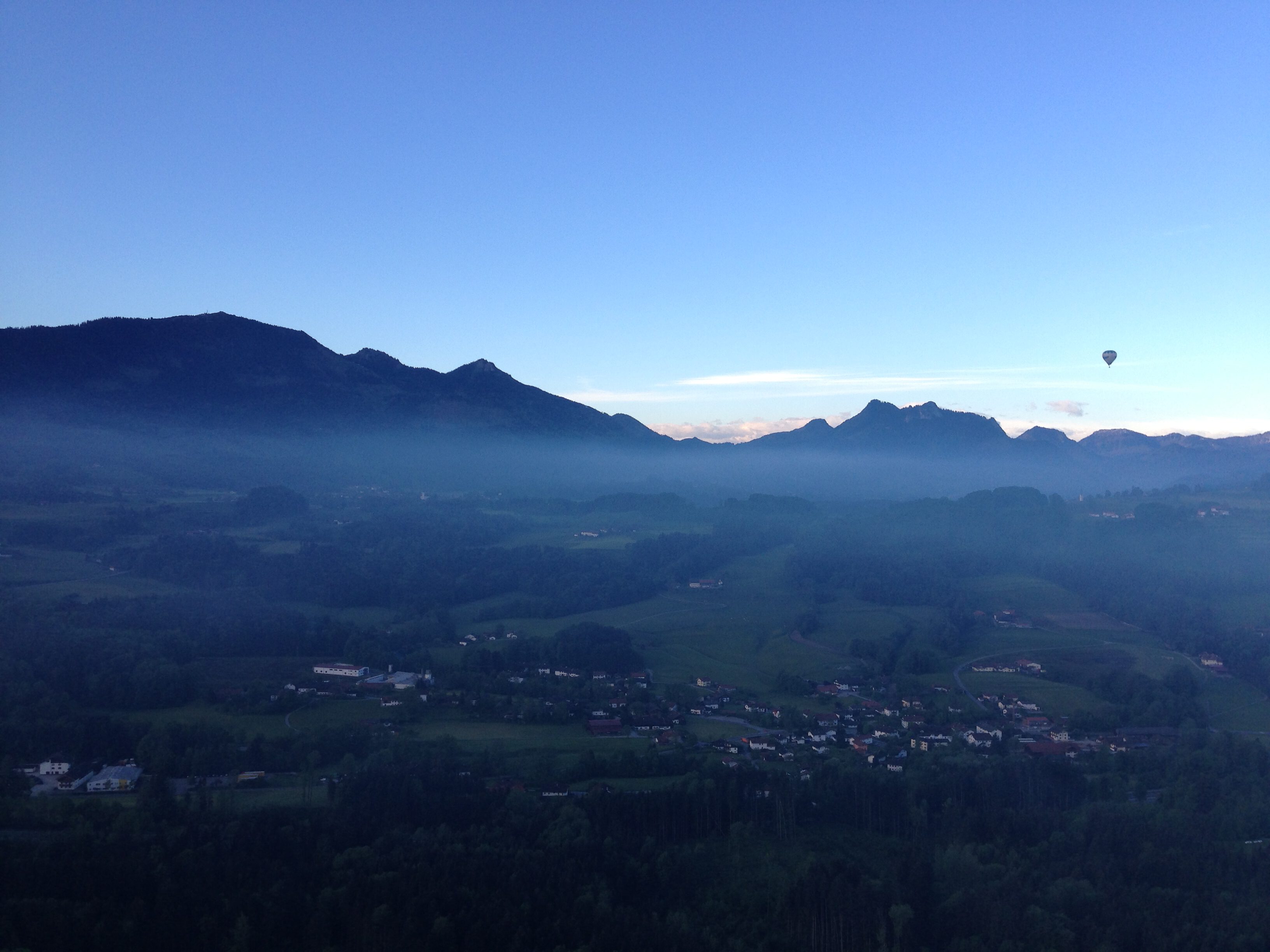 Langsam verlieren wir an Höhe. Der Brenner faucht in regelmäßigen Abständen, während der Pilot seinen Blick wachsam über Landkarte und Horizont schweifen lässt. Wir treiben weiter Richtung Nordwesten, der Walchsee liegt längst hinter uns, das Gebirge ist nur noch Silhouette, wir fahren mit dem Ballon über dem Chiemgau. Unten ziehen die ersten Häuser von Achenmühle vorbei, Gärten, Garagen, Dächer. Sehr nah, manchmal beängstigend nah.