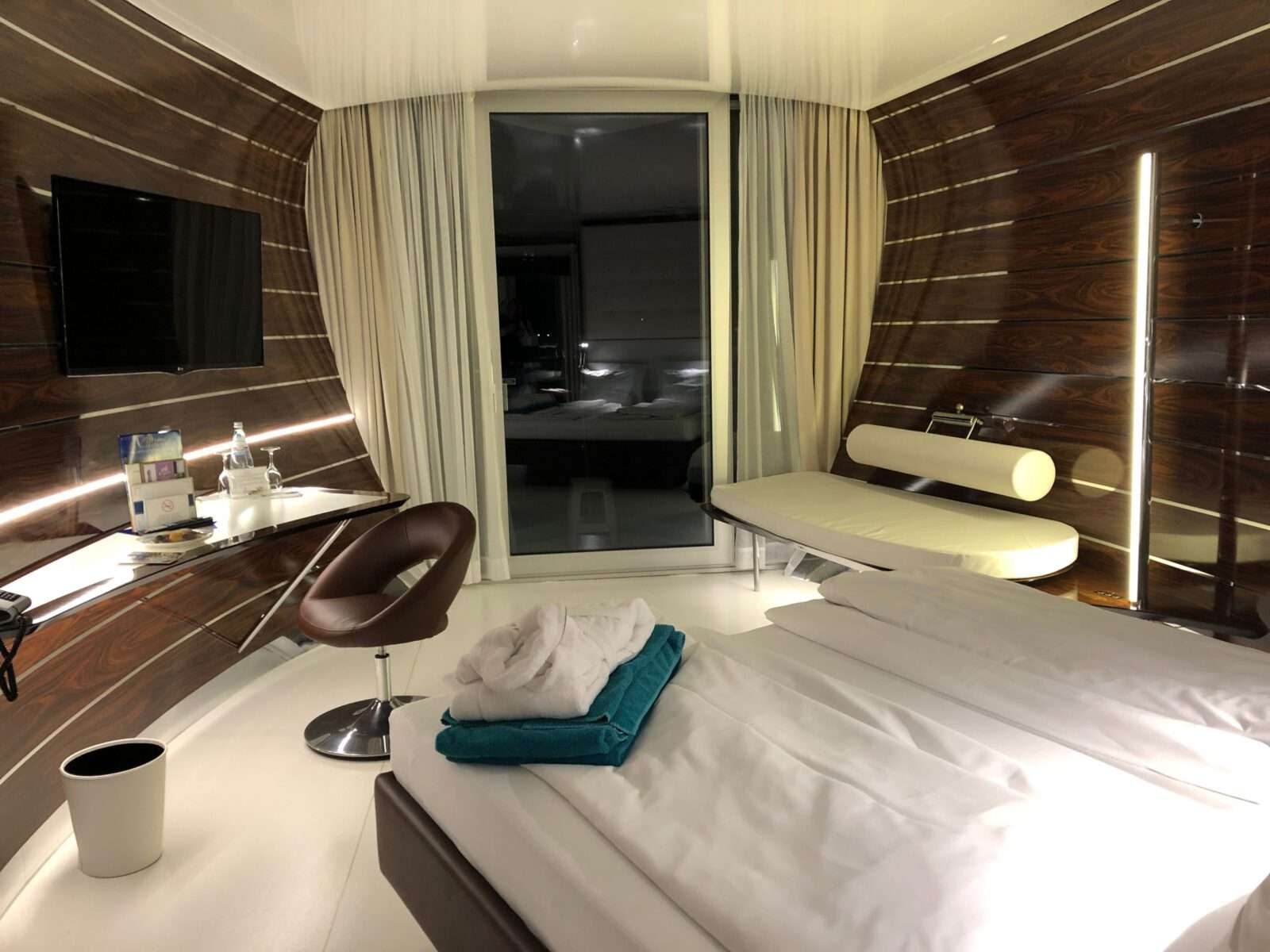 Wie auf einer eigenen Luxus-Yacht fühlen sich die Gäste in den modernen Yacht-Kabinen mit Palisander, hochwertigen Textilien, extra hohen Traumbetten und Balkonen in Schiffbugsform.
