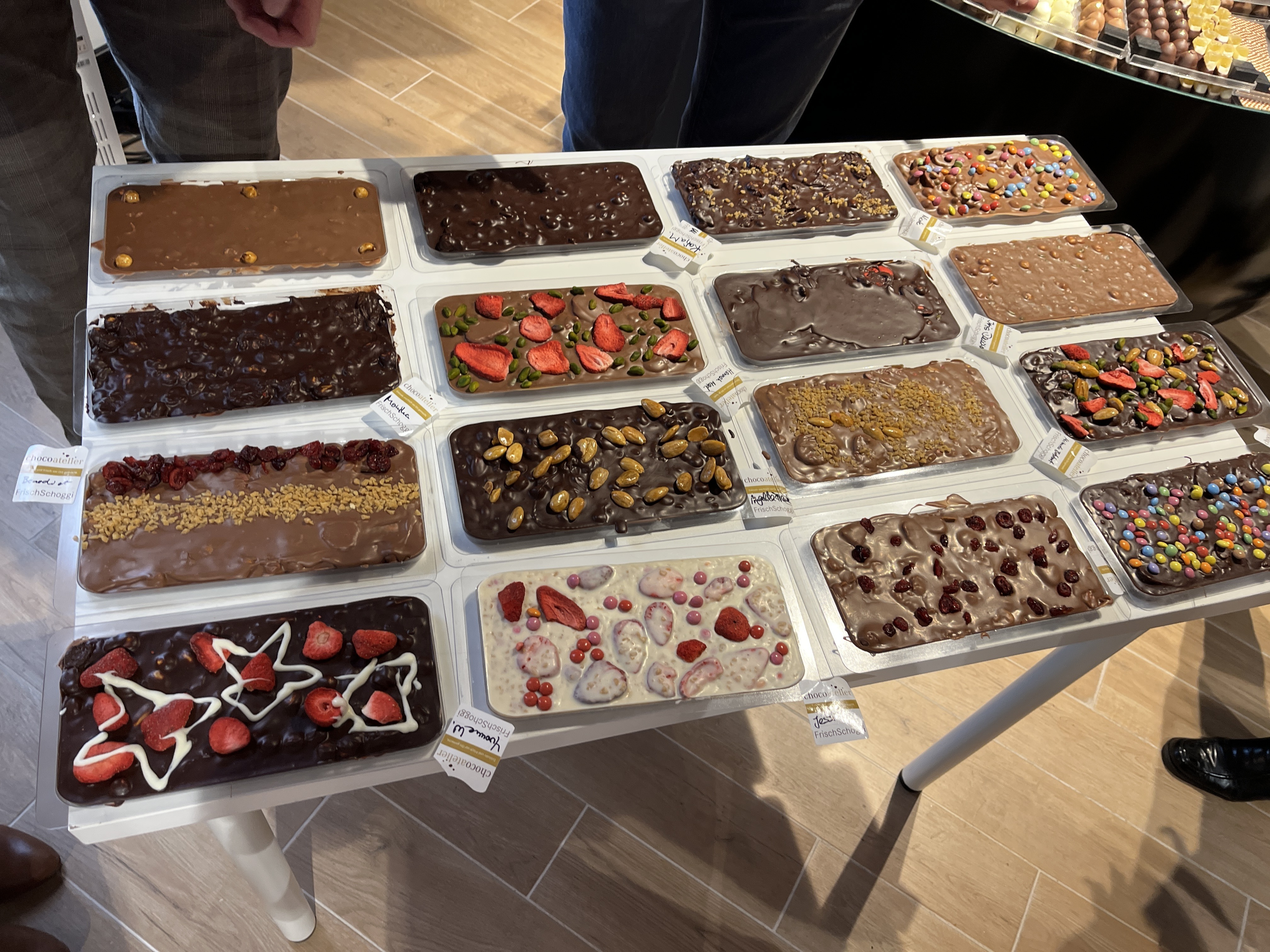 An der großzügigen Theke darf man sich aus mindestens 20 FrischSchoggi-Varianten bedienen lassen. Hier wird nicht einfach nach Gewicht verkauft, sondern nach Wunsch: Welche Nüsse? Welche Früchte? Hell, dunkel oder weiß? So entstehen individuelle Tafeln, oft kunstvoll garniert und sofort zum Verlieben.