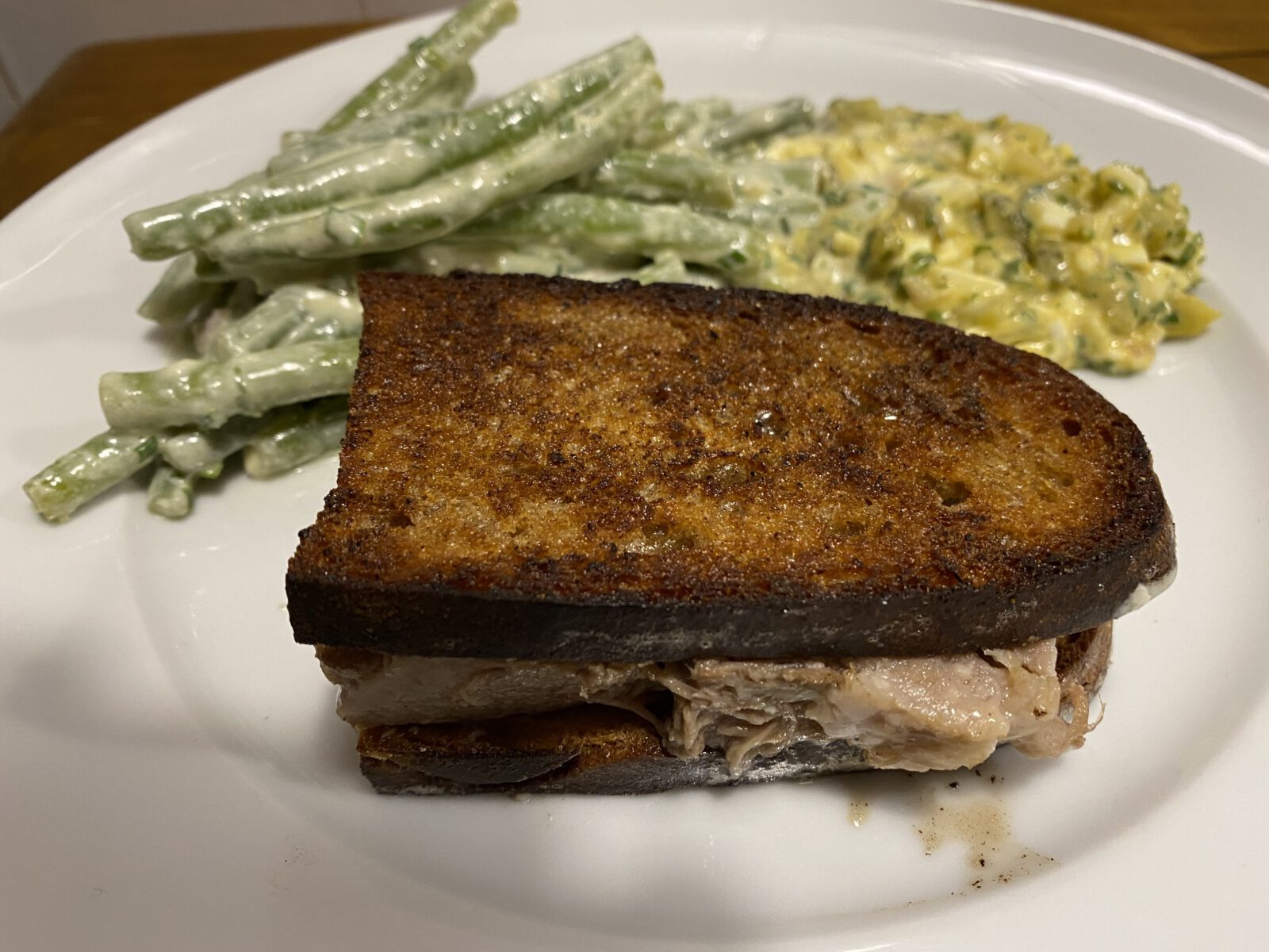 Der Clou liegt im nächsten Schritt: Die kalte Terrine in dünne Scheiben geschnitten, zwischen Ciabatta-Scheiben gelegt und kurz in der Pfanne sanft gebräunt. So entsteht eine faszinierende Kombination aus weichem, aromatischem Fleisch und knusprigem Brot – eine Texturkomposition à la Hans Haas. Kombiniert wird das Ganze mit Meerrettichbohnen, die durch ihre kühle Frische, Schärfe und Crunch das Gericht elegant ergänzen.