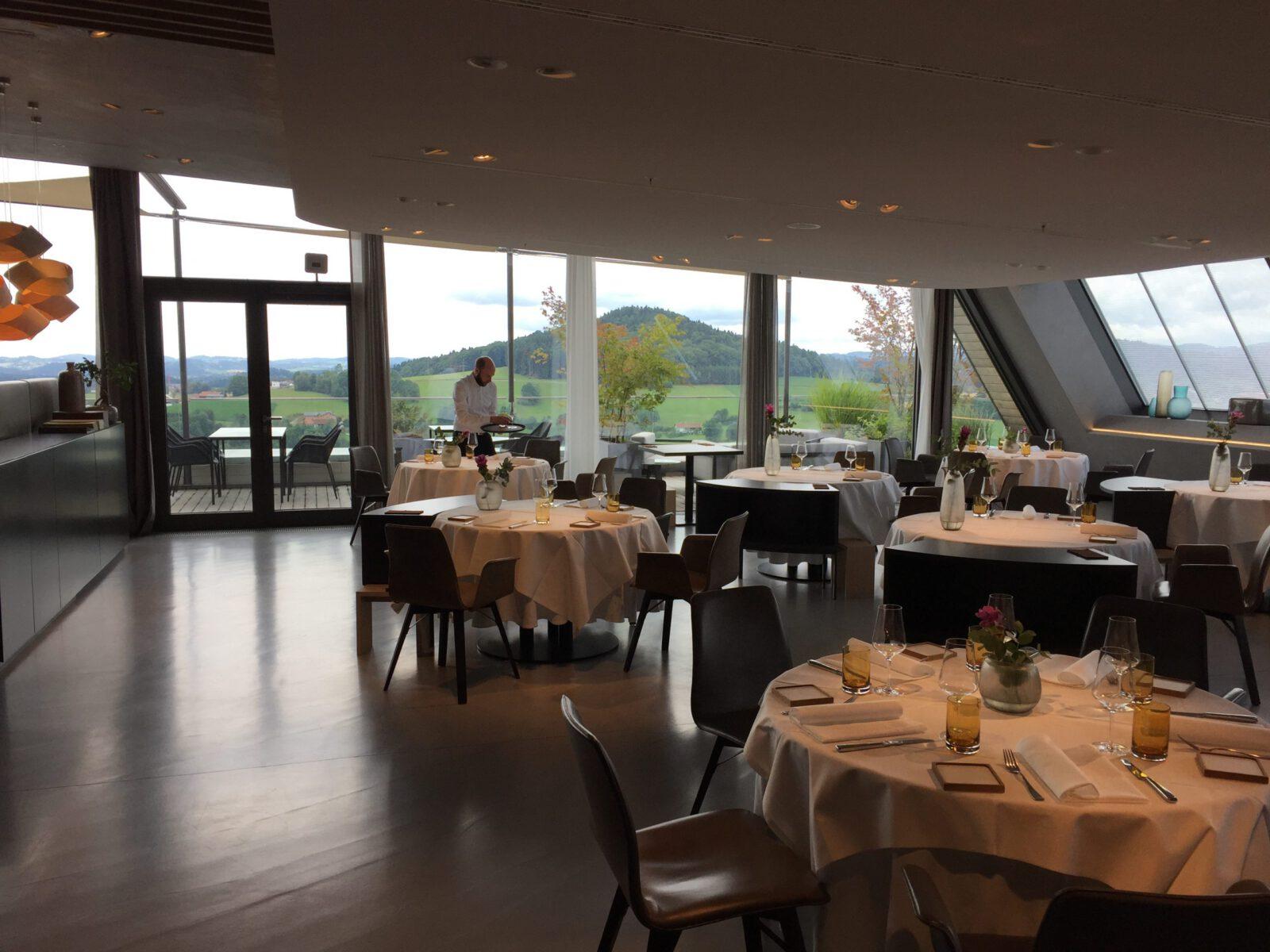 Die Terrasse ein Traum, nicht nur beim Blick auf den Sonnenuntergang. Geschmackvolles Interieur mit Lounge-Charakter in erdigen Tönen. Sehr klare Linien. Die offene blitzblanke Küche erlaubt diskrete Blicke. Edel, aber zwanglos. Wer hier sitzt, kann in die einsehbare Küche schauen oder hat an der Fensterfront eine fantastische Aussicht über die Landschaft. Der Blick auf Teller und Küchenkunst nach dem Motto „Innovation & Tradition“ ist allerdings vergleichbar fantastisch.