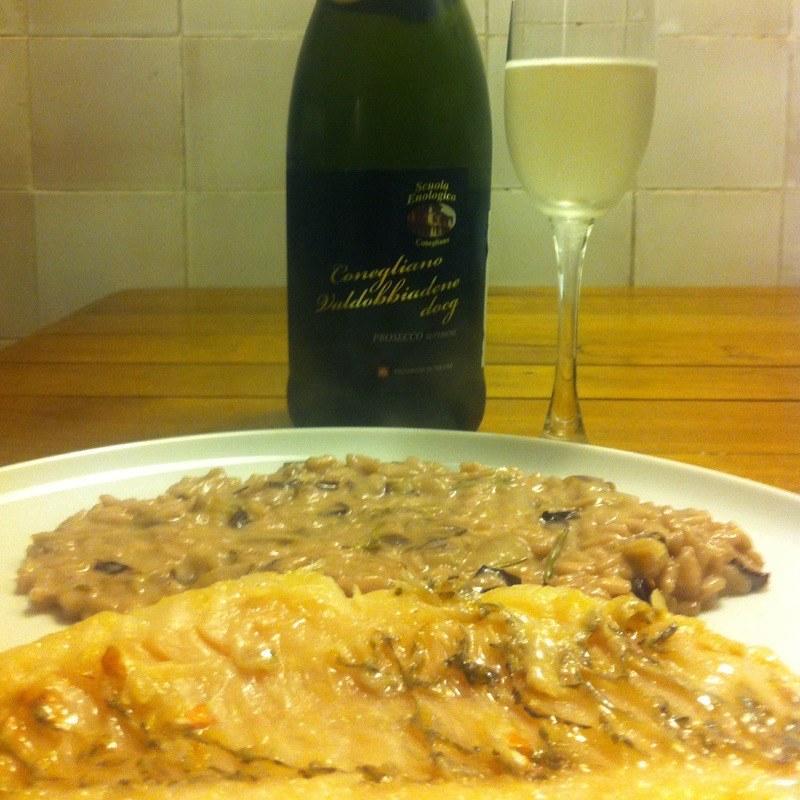 Dies Gericht ist (fast) Norditialien pur. Die Provinz Treviso steuert den größten Teil bei. Denn sowohl der Radicchio als auch der Prosecco stammen aus dieser Gegend nördlich von Venedig. Und es sollte auch keine Supermarkt-Schund sein. Wir genießen einen richtigen Prosecco, den Conegliano Valdobbiadene DOCG. In diesem Fall von der Scuola Enologica di Conegliano. Deren Prosecco ist hervorragend und passt bestens zu unserem heutigen Rezept.