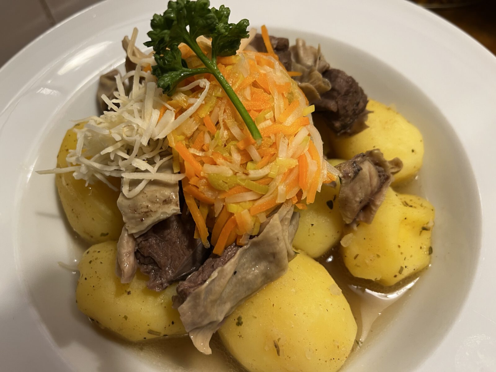Das Kalbfleisch wird ähnlich serviert wie Tafelspitz: mit Möhrengemüse, Kren und Kartoffeln. Ein sehr feines Gericht.