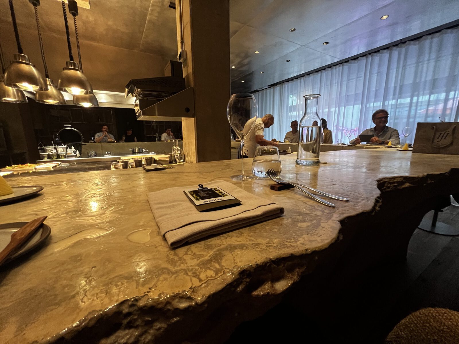 Das Tisane besteht – ganz radikal – nur aus einem einzigen Element: einem massiven u-förmigen Tresen, der bis zu 16 Gäste fasst. Dahinter und mittendrin: die Küche. Keine Trennung, keine Distanz. Man blickt direkt in die Gesichter der Köche, sieht jede Bewegung, jedes letzte Finish. Und das hat eine ungeheure Wirkung.